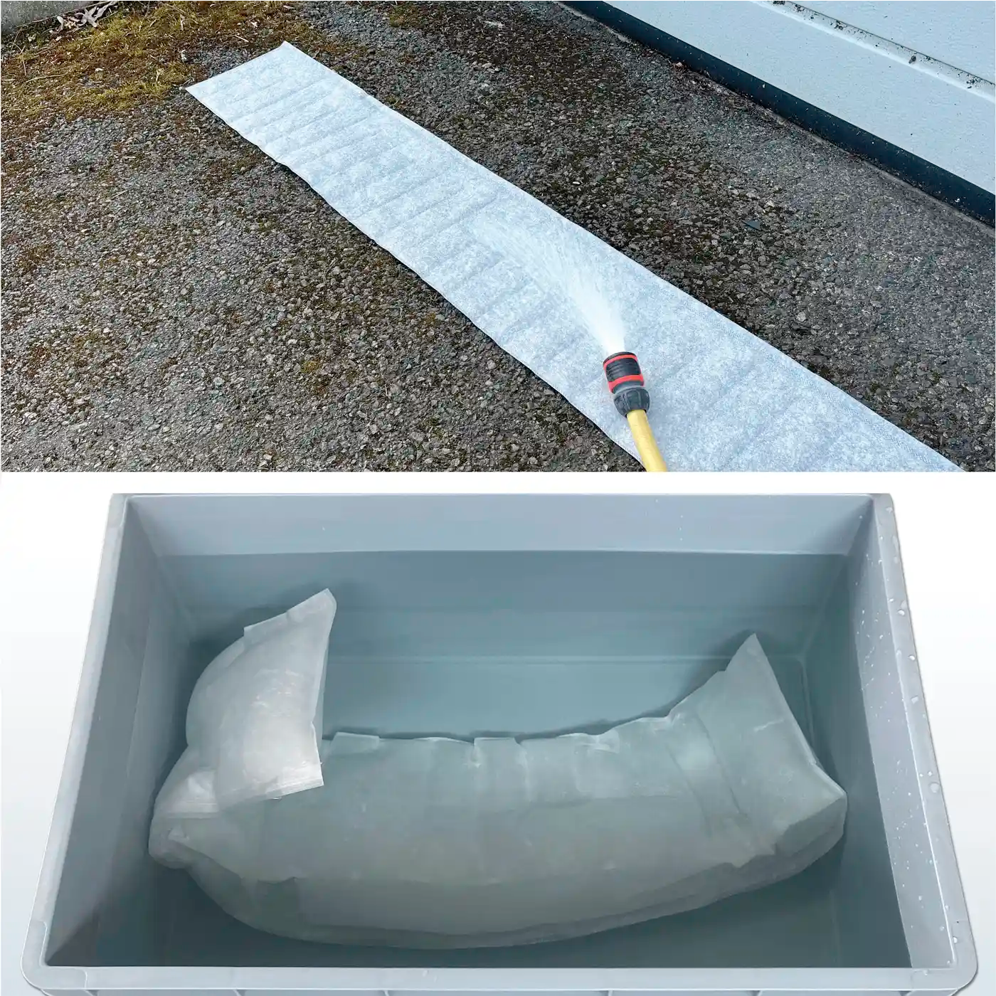 Use the tubes to create flood barriers: activate them by submerging them in water for 3 to 7 minutes, then place them in front of the openings to be protected. If several lengths are needed, place the tubes against each other, without any space between them. Remember to wrap them in the provided tarpaulins for optimal effectiveness and waterproofing. This way, they retain up to 10 cm of water.